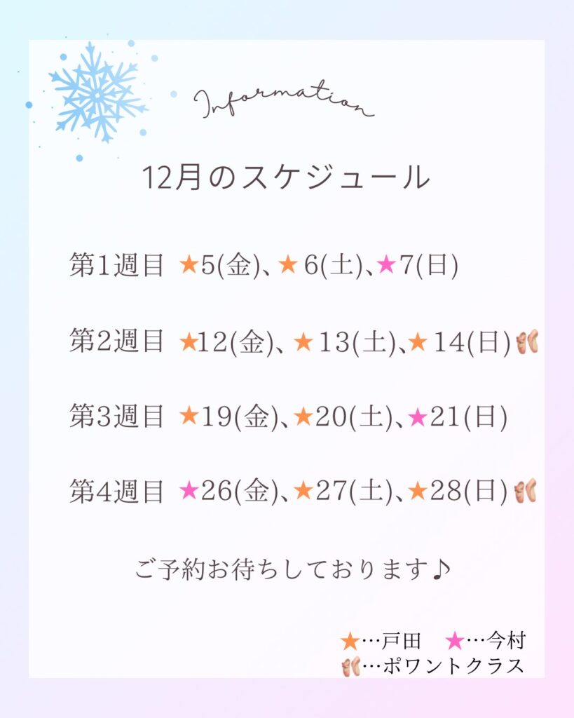 【12月のスケジュール】 今月も4週分開講いたします🗓️14日(日)と28日(日)はポワントクラス有りです🩰 早いもので今年も終わりに近づいてきましたね❄️一段と冬らしい気候になり、寒さで身体が固まってる方も多いかと思いますのでゆっくりと暖めながら動かし... -