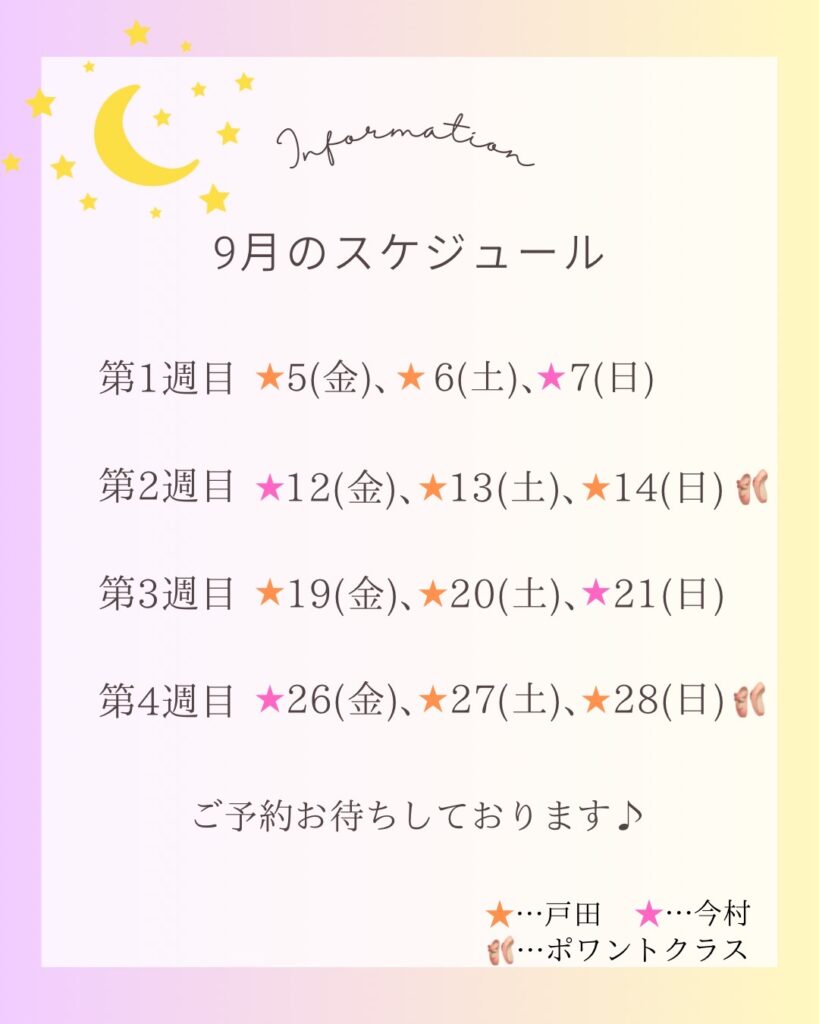 【9月のスケジュール】 今月も4週分開講いたします🗓️14日(日)と28日(日)はポワントクラス有りです🩰 まだまだ暑い日が続いておりますのでレッスンの際も水分をこまめに取りながら身体を動かしていきましょう🥤💪🏻 皆さまのご予約お待ちしております🌟 ◆金... -