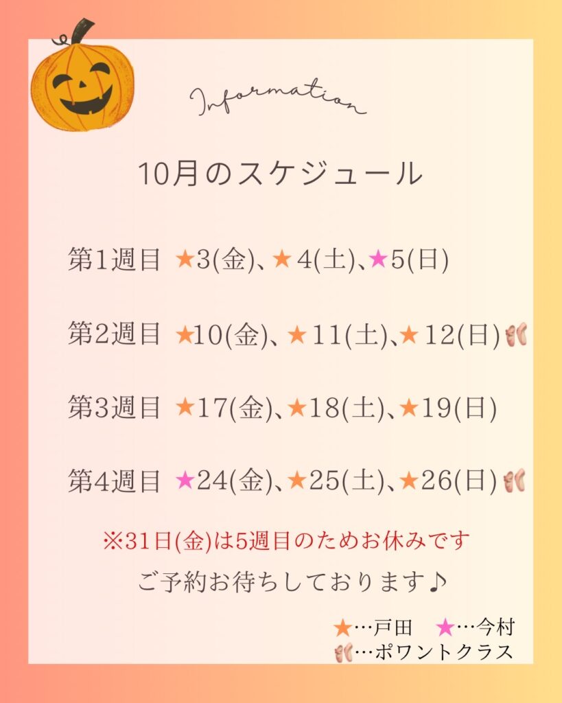 【10月レッスンスケジュール】 今月も4週分開講いたします🗓️12日(日)と26日(日)はポワントクラス有りです🩰 また31日(金)は5週目のためお休みになります。お間違いのないようご注意ください🙇🏼♀️ 少しずつ暑さも和らいできて身体が動かしやすい季節にな... -
